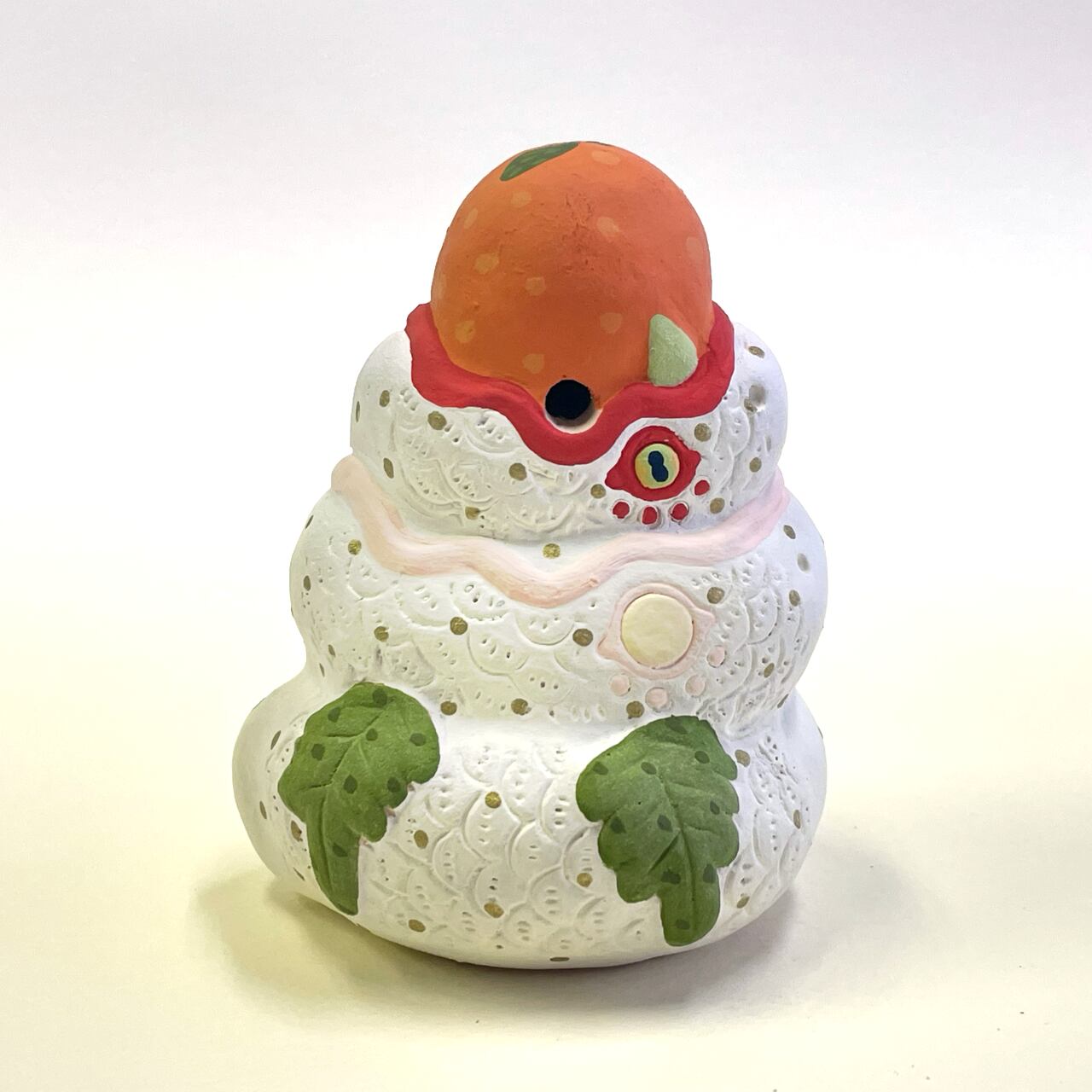 鏡餅の段を重ねた姿が、白蛇がとぐろを巻いた姿と似ていることから合わせてみました。